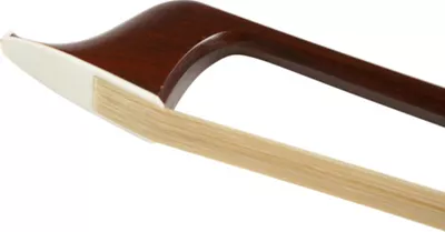 The Bellafina Brazilwood French Bass Bow is made with an octagonal Brazilwood stick, a half-lined ebony frog and Mongolian horsehair. It features a pearl eye and slide, nickel/silver ferrule and leather grip.