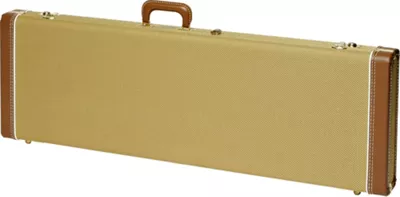 The Fender Jazz Bass Hardshell Case has a Tolex cover, made in the traditional shape with locking latch, protective vinyl ends, large accessory compartment, black padded poodle plush interior, and genuine Fender logo.