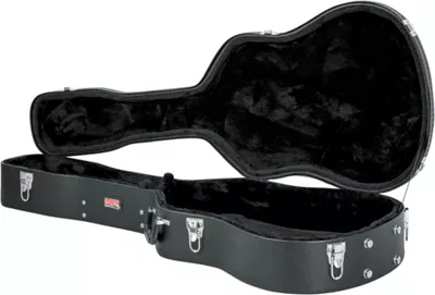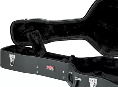 The Gator GWE-Dread-12 Hardshell Archtop Guitar Case protects a dreadnought 12-string guitar from the rigors of the road. Features rugged 5-ply cross-grain plywood construction with Tolex PVC covering, attractive contrast stitching, comfortable matching handle, metal feet on the bottom and side, plush padded interior with accessory compartment, and locking latches for security.