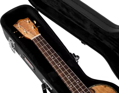 Durable and protective black hardshell case for tenor ukulele. It features a carry handle and locking latches, and prevents damage to your instrument in transport and in storage.