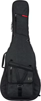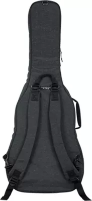 Gator’s Transit Series Acoustic Guitar gig bag is a charcoal black colored bag constructed of a weather-resistant blended fabric exterior that protects your guitar with 20 mm thick foam interior padding covered with a plush micro-fleece lining, as well adjustable and removable three-point padding system specifically for the headstock, neck and bottom/endpin areas. Designed to fit most acoustic guitars, it has the added protection of thick rubber tread on it’s bottom to keep your instrument safe from puddles and spilled drinks. The rigid interior construction within the frame gives you extra case-like protection. Other features include a large front zippered pocket with flap, G-hook buckle and seatbelt loops, small front flap pocket, molded, padded, contoured handle, Padded, removable, color matched backpack straps, and multiple d-rings for clipping accessories.