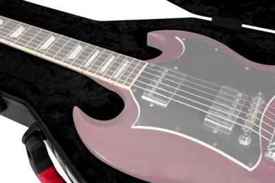 Plush-lined hardshell case for SG and other dual cutaway guitars, fits most models. ATA case with TSA latches, easy air travel, great for local transport as well. Lightweight, rigged and protective.