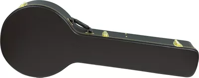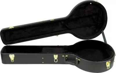 This banjo case is designed to fit all standard 4- and 5-string banjos. Features textured black vinyl covering, 5-ply wood construction, black plush lining, gold-plated hardware, interior accessory compartment, and locking fasteners.