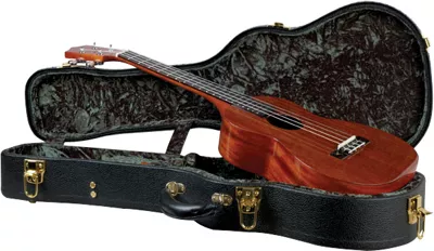 This hardshell Silver Creek Baritone Ukulele case is vintage in every detail. With a heavy-duty arched top and crushed velvet interior, this uke case also has a black Tolex covering, 20mm of high-density padding, and an accessory compartment. Silver Creek added a leather handle for carrying, 6 latches, and a locking mechanism. Modeled after classic prewar style cases, the vintage Silver Creek Bariton Ukulele Case protects your uke with its tough design and dense interior.